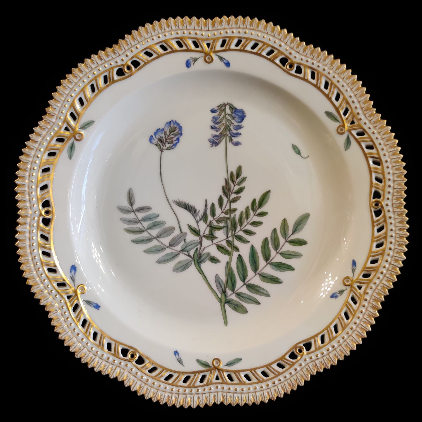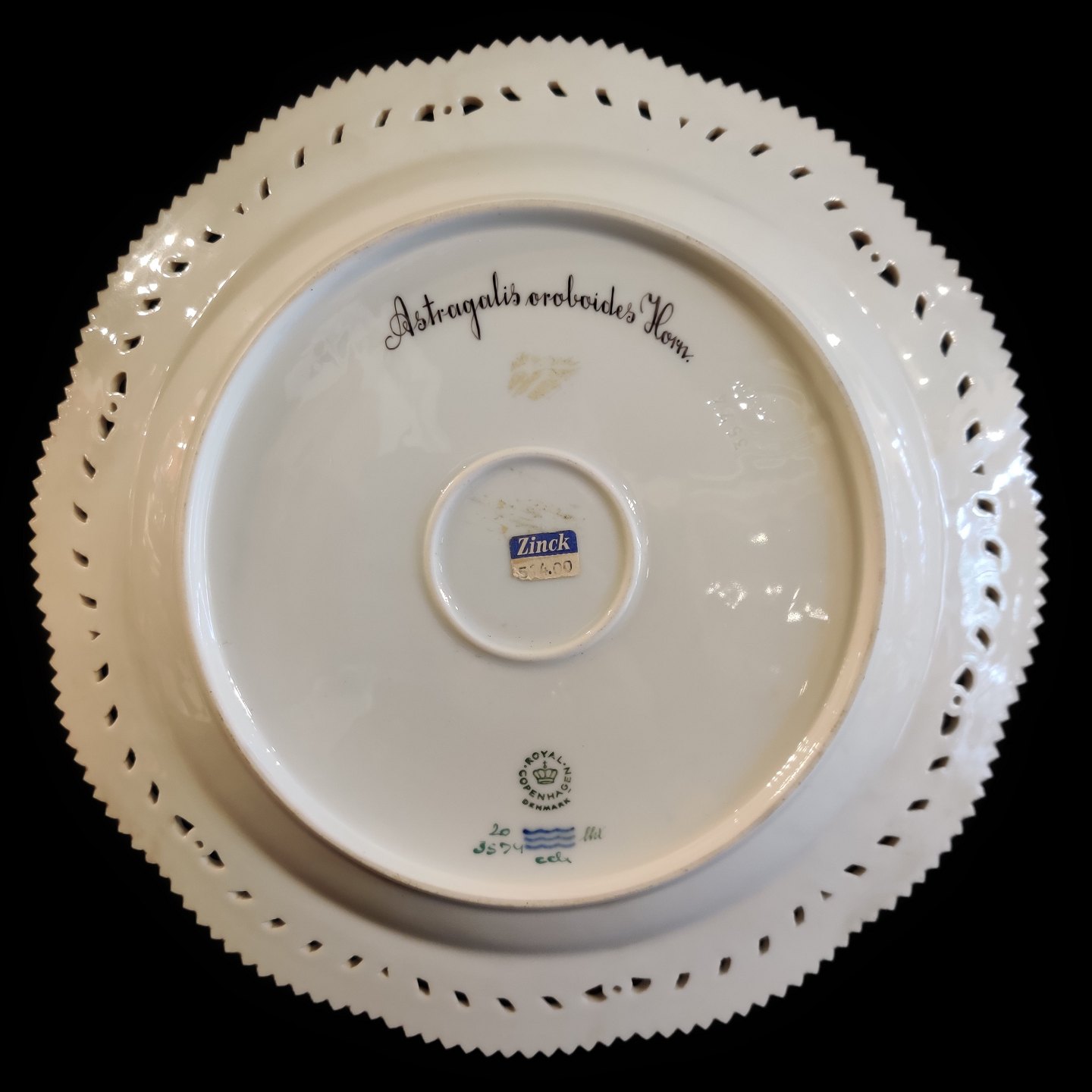 Royal Copenhagen, Flora Danica porcelæn; Fad/stor tallerken #3574 med gennembrudt kant.