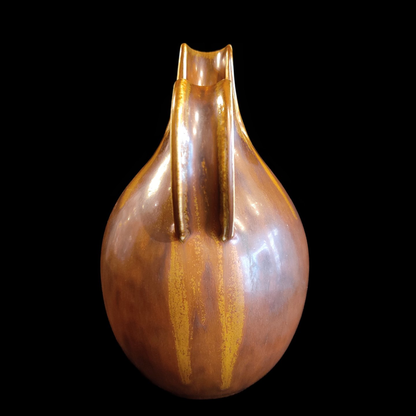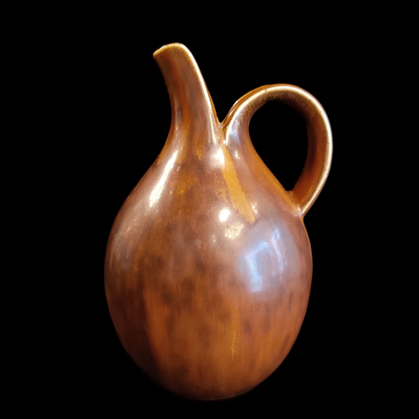 Eva Stæhr-Nielsen for Saxbo; Spaltekande i stentøj dekoreret med brun glasur #64. H. 18,5 cm.
