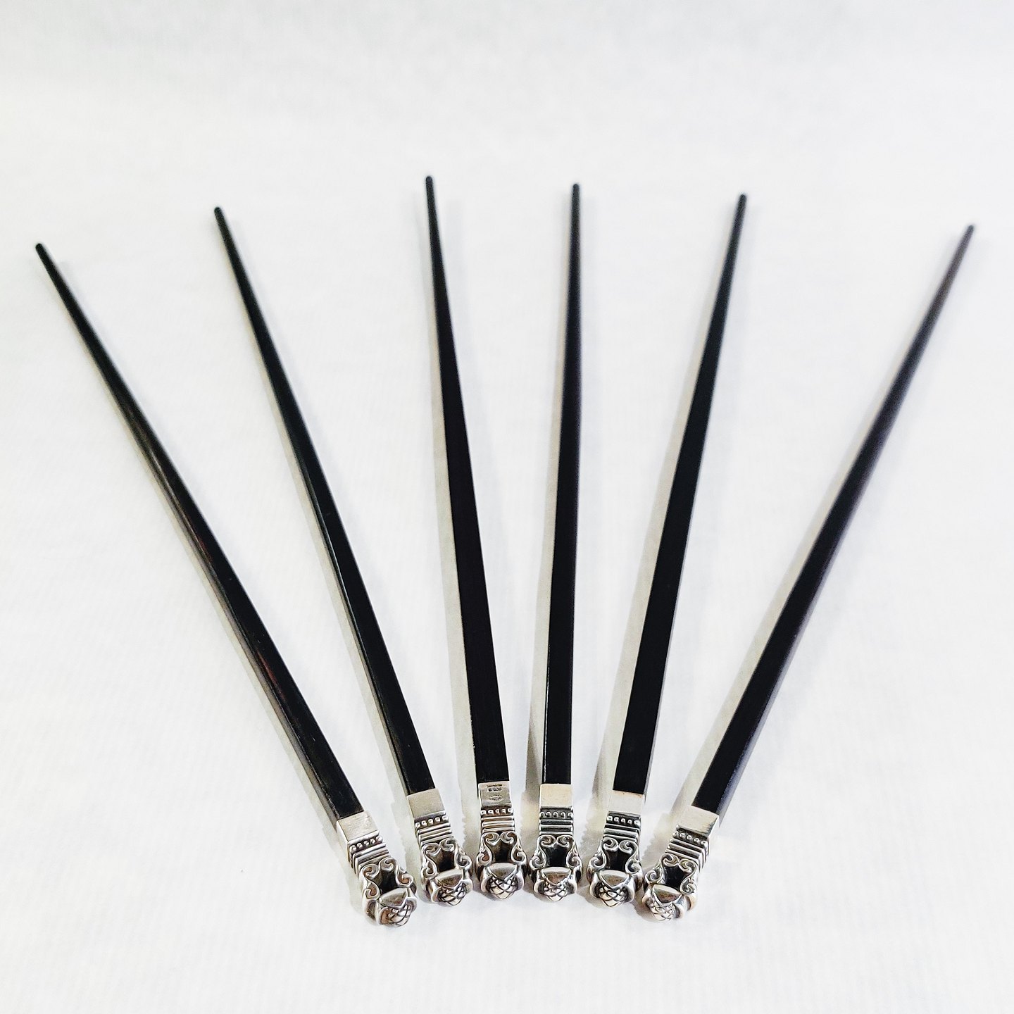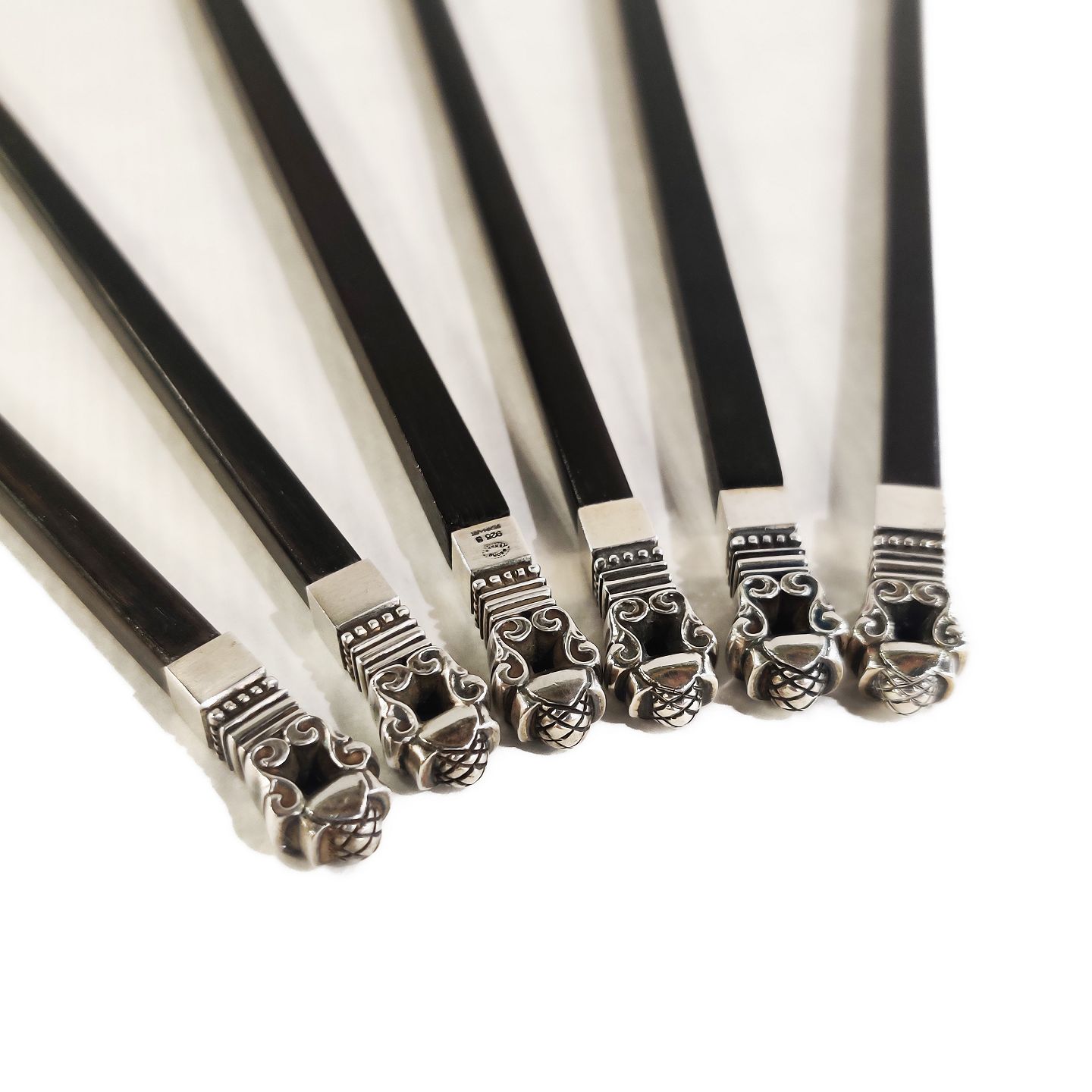 Johan Rohde for Georg Jensen; Sæt på seks Konge spisepinde (tre par) i sølv og ibenholt. L. 26,3 cm.