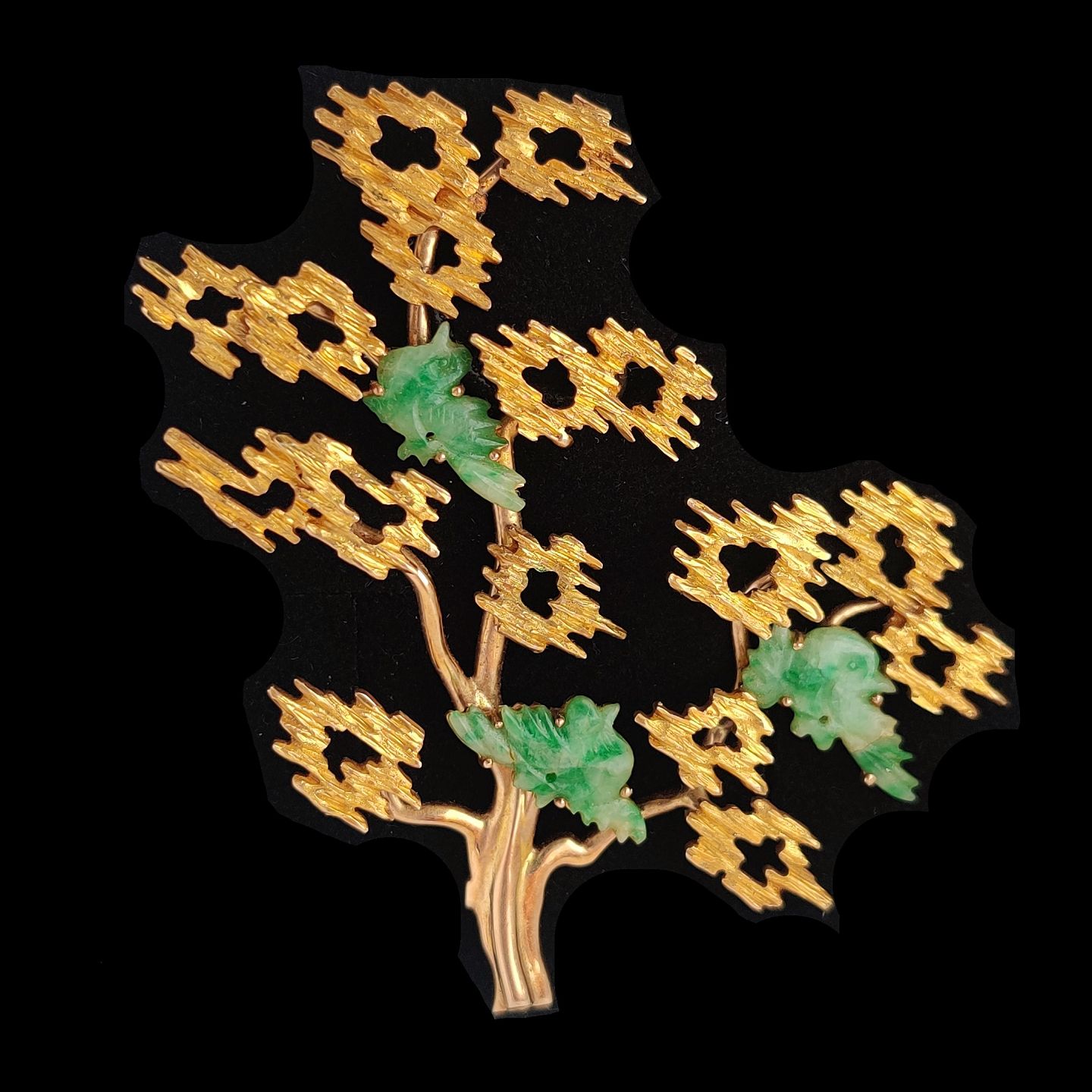 C. Antonsen; Stor broche af 14 kt. guld prydet med jade. Guldbrochen har form, som et træ, hvori der sidder fugle i jade.