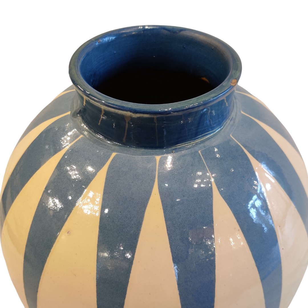 Herman A. Kähler; Stor vase i lertøj med mønster i råhvid og blå glasur. fra omkring 1940-1950. H. 35,5 cm. Diam. ca. 30 cm. Diam. top 13 cm.