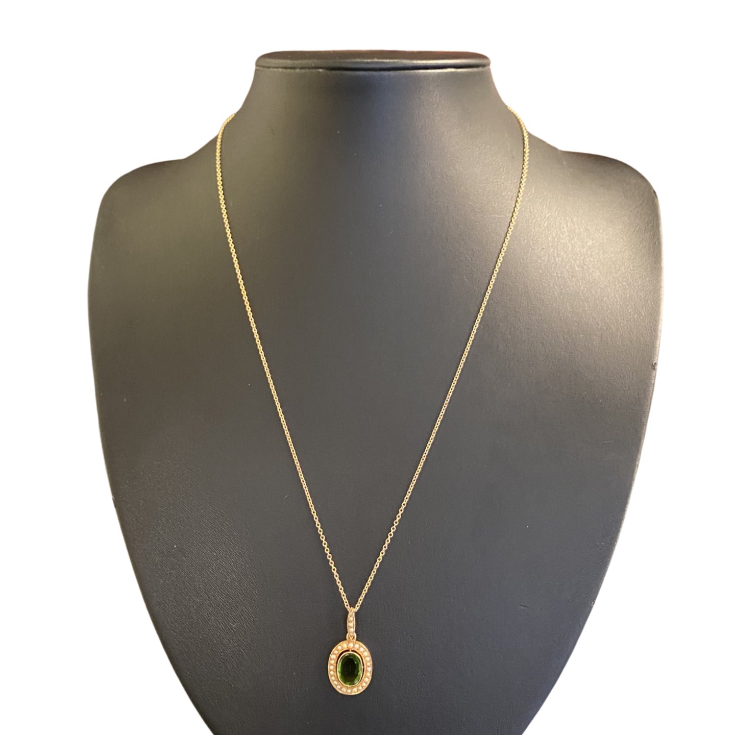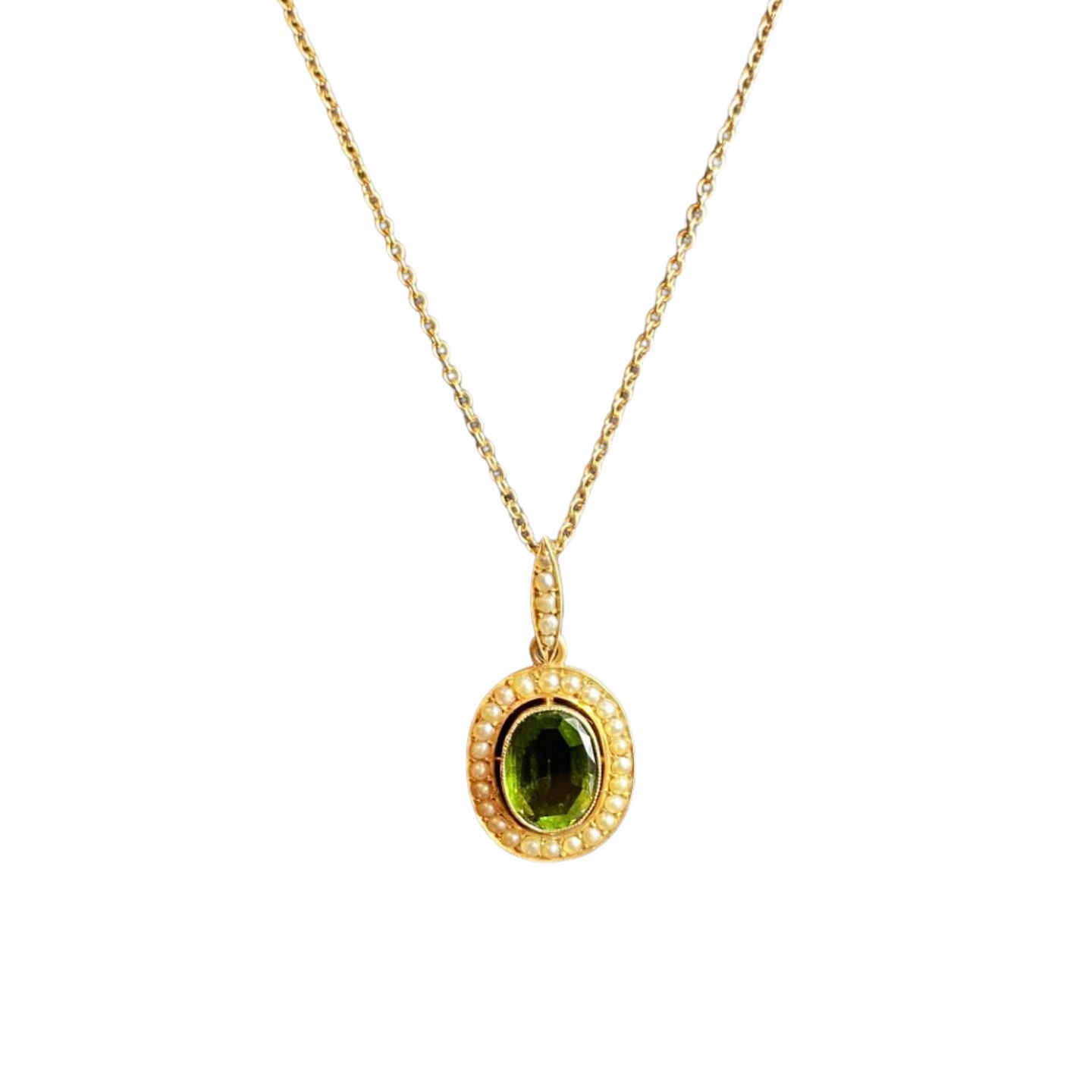 E. L. Weimann; Halskæde i 14 kt. guld med peridot og perler.