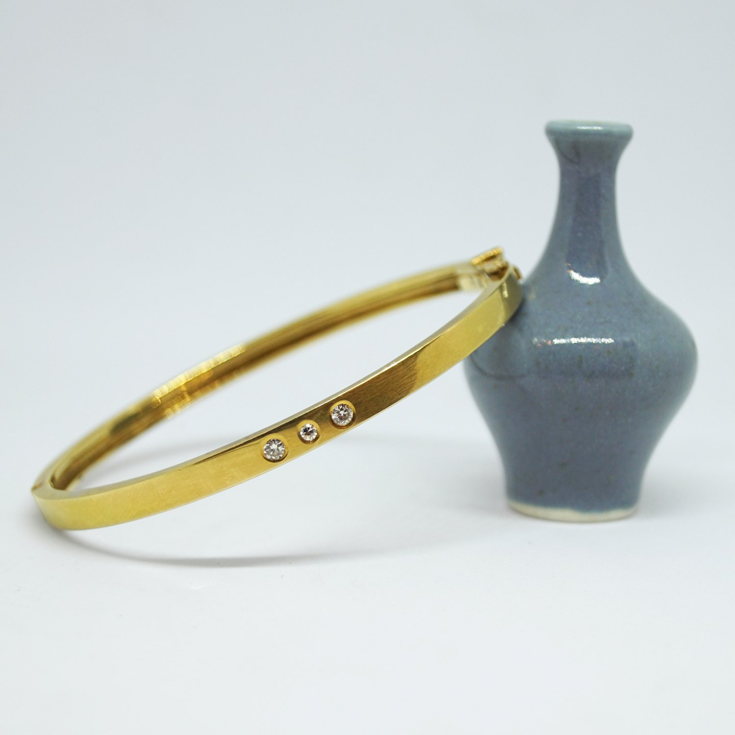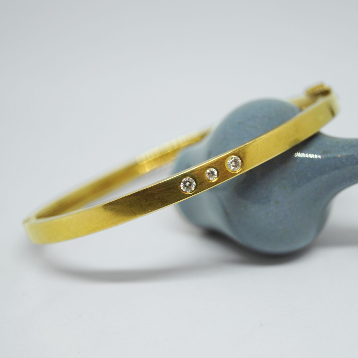 Oval guldarmring i 18 kt. prydet med tre diamanter, i alt ca. 0.23 ct.