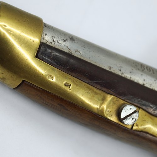 Skæfte af valnød, beslag af messing alle stemplet med kronet bogstav.