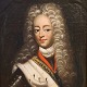 Samtidig maleri af Kong Frederik den 5. (1723-1766), med Allongeparyk og rustning hvor han bærer et klæde af hermelin henover. I guldramme. Maleriet er malet på lærred og senere opsat på plade.