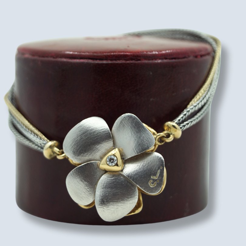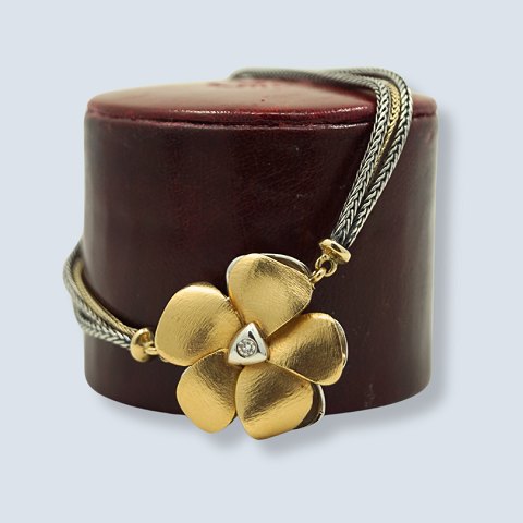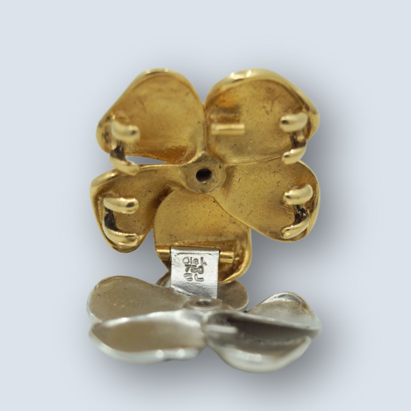 Charlotte Lynggard for Ole Lynggaard; A flower clasp, made of 18k gold and white gold with two brillant-cut diamonds, total weighing 0.10 ct. Colour: Top-Wesselton (G).