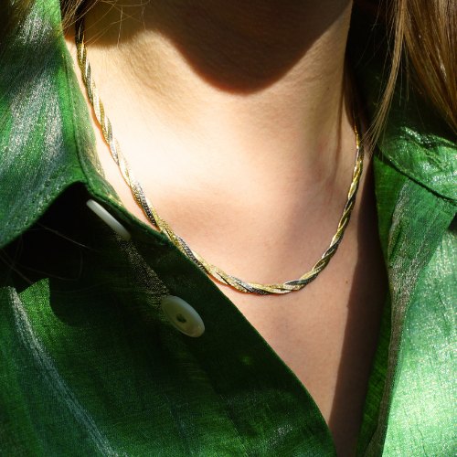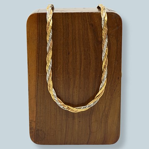 Halssmykke af 18 kt. guld, hvidguld og rødguld. "Flettet" mønster.