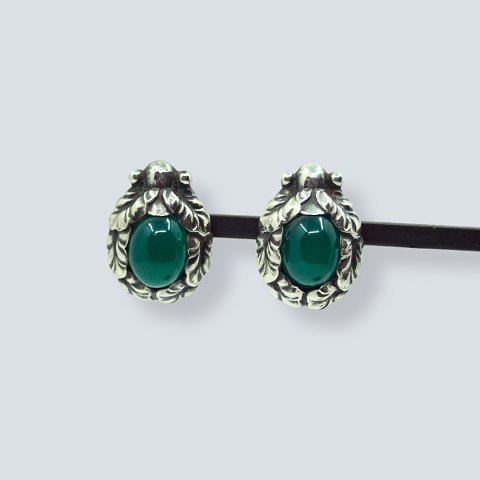 Georg Jensen; Ørestikker af sterling sølv prydet med chrysopras #34. Øreringene er oprindelig lavet, som øreskruer, senere ændret til ørestikker. H 1,9 cm. B. 1,4 cm.