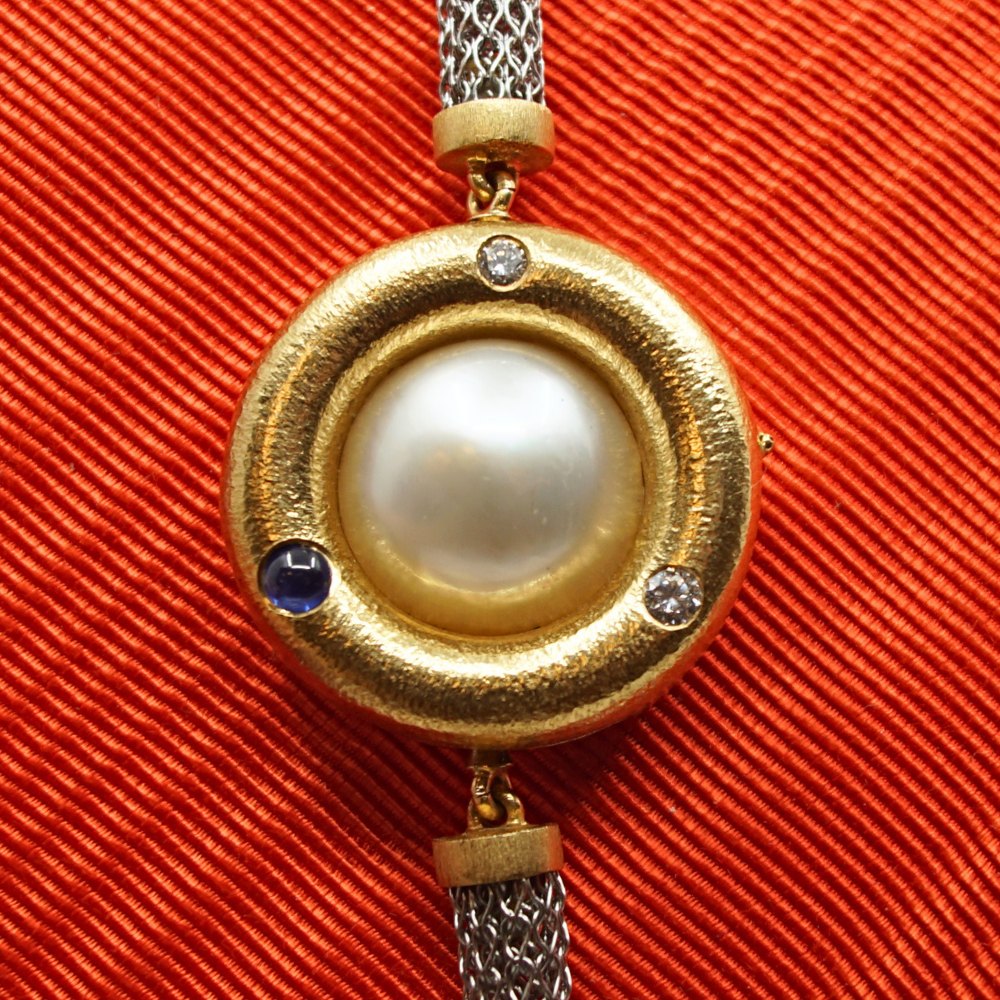 Ole Lynggaard; 'Uranus' smykkelås af 18 kt. guld med perle, safir og diamanter