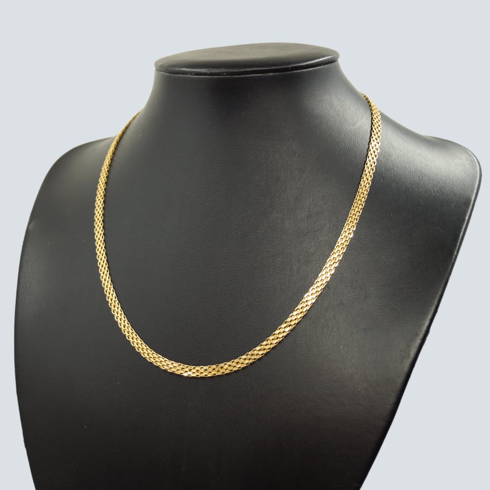 Halskæde i 14 kt. guld. L. 45,5 cm. B. 4 mm. Antik Damgaard-Lauritsen køber guld, sølv og smykker - både til videresalg og til omsmeltning. Vi synes, det er synd at smelte den danske kulturarv - hvis den kan reddes.