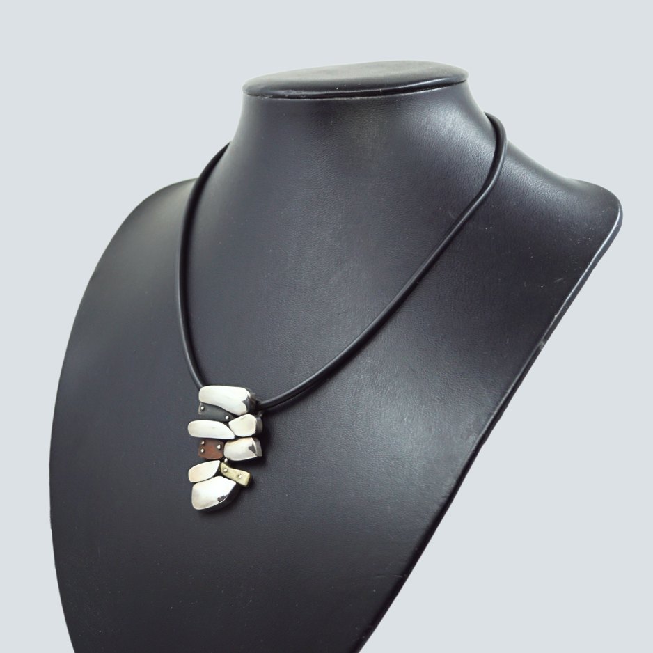 Anette Kræn; Vedhæng i sterling sølv. Isat en gummikæde med sølvlås. Den nederste del af vedhænget er bevægelig. Vedhæng h. 4,1 cm. B. 2,8 cm.