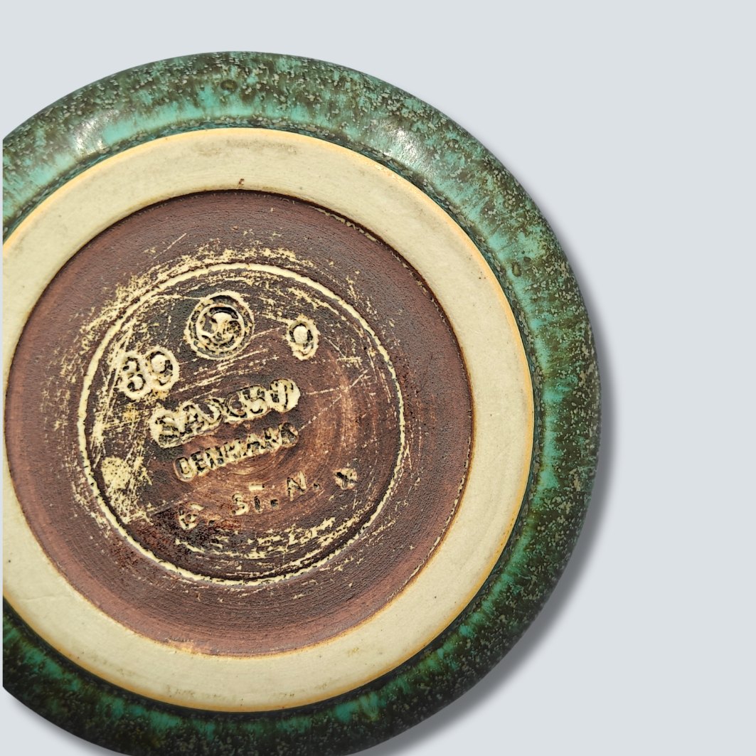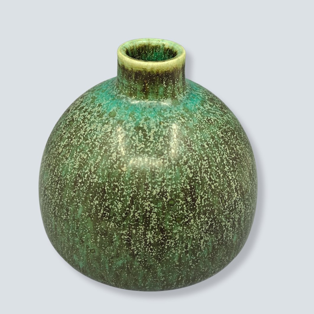 Eva Stæhr-Nielsen for Saxbo; Vase i stentøj dekoreret med grøn glasur #39. H. 9,3 cm. Diameter ca. 9 cm.