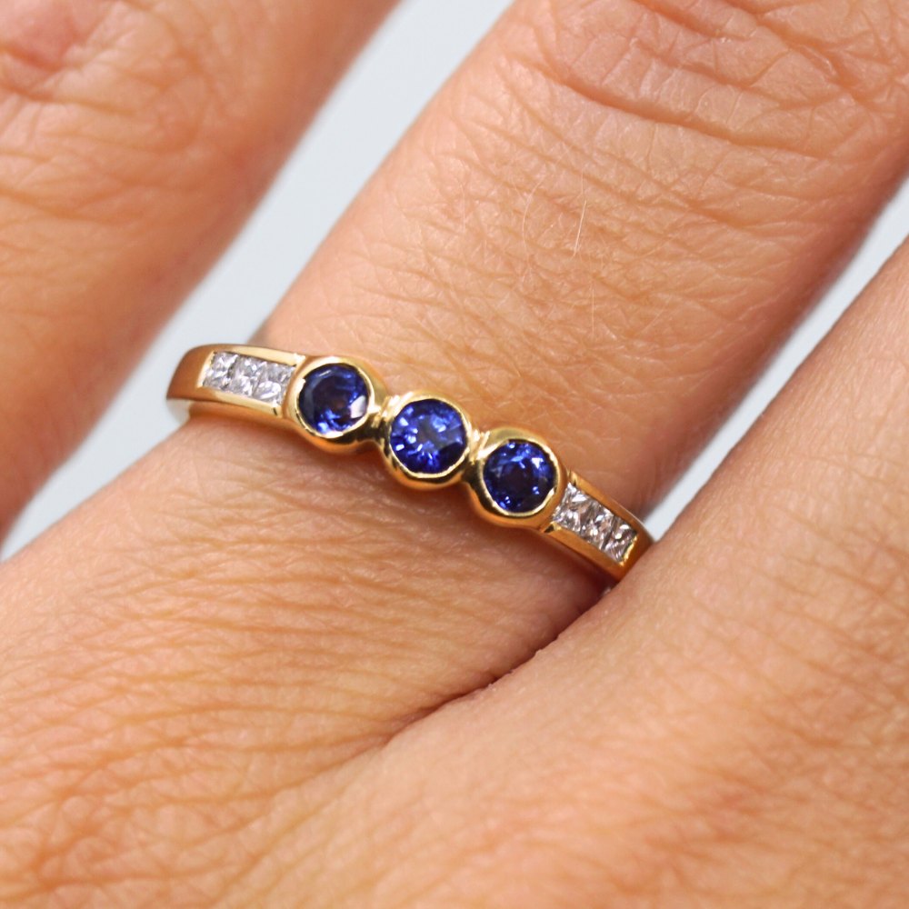 Ring i 18 kt. guld, prydet med tre safirer og seks diamanter, i alt 0.12 ct. Ring str. 50-51. Stemplet "750". Kontakt os gerne, hvis du søger noget specifikt. Hvad du ser på vores hjemmeside, er blot et udvalg af det, som vi har.