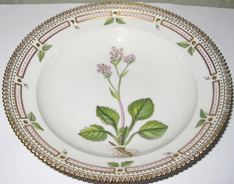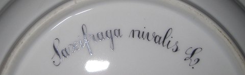 Kgl. Porcelæn Flora Danica Dyb Tallerken 20/3546 nyt nummer 604. Måler 22,3cm. Blomsten er: Saxifraga Nivalis L. Første sortering og i perfekt stand.