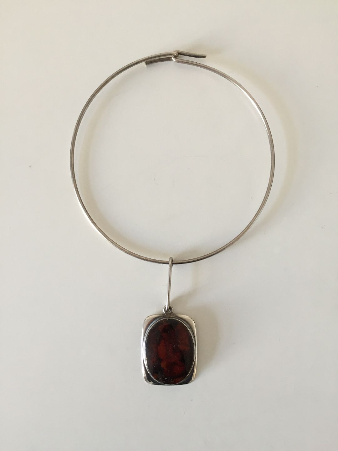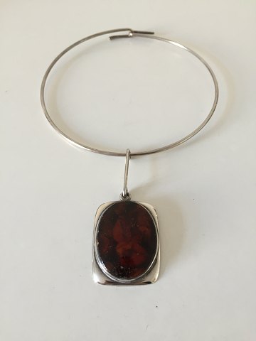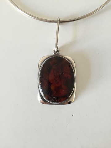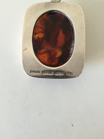 Bent Knudsen Halssmykke i sølv og rav. Mærket sterling, Denmark, Bent K, 35. Måler 12,5 cm i dia og selve smykket 4,5 cm. I rigtig fin stand, men rav stykket har lidt slid. Vejer 43 g