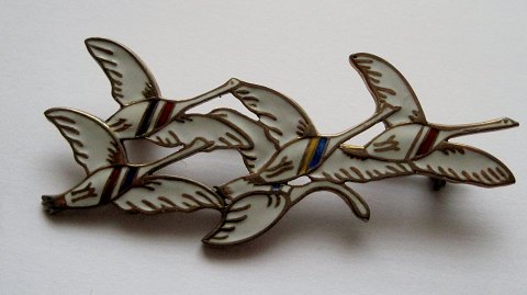 Erik Magnussen Sterling Silver Broche with enamel of 5 swans. Broche with 5 swans sympolizes the 5 nordic countries, 1940. In perfect condition and measures 6cm.