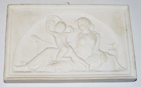 Royal Copenhagen Biscuit Platte Biscuit Bacchantinde holder en drueklase i vejret for en lille satyr No 85. Kopi af O.H.B. Olrik fra 1849 after Thorvaldsens original fra Rom 1833. Måler 15 x 9cm.