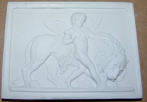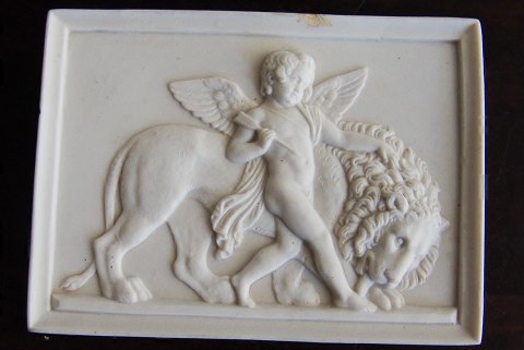 Bing & Grøndahl Biscuit Platte Amor med den tæmmede Løve No 76. Kopi efter Thorvaldsens original fra Rom 1828. Måler 13,5cm x 10cm.