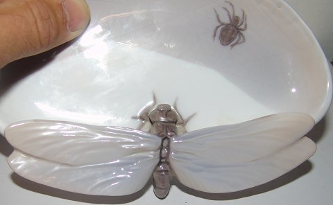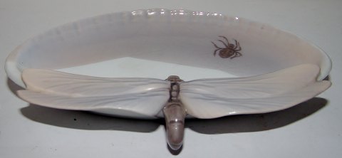 Royal Copenhagen Art Nouveau Dragonfly and Spider Dish No 9/15. Measures 17cm. The condition is okay, but it has been rapaired. The repair is very good and it is difficult to say what has been wrong with the wings, but something has been made on them. But EXSTREMELY difficult to tell.