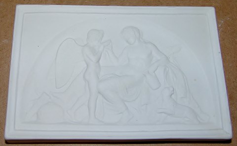 Royal Copenhagen Bisque Plate Amor at Bacchus No 66. Copy by Th. Mule 1847 after Thorvaldsens Original from Rom after 1810. Measures 15cm x 9cm.