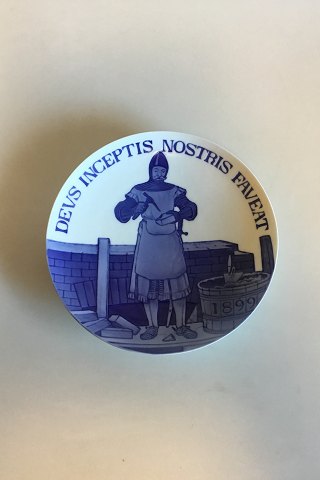 Royal Copenhagen Commemorative Plate from 1899 RC-CM32. Measures 22 cm / 8 21/32 in. and is in perfect condition. Armed mason on scaffolding. Commissioned by the Free Mason Lodge in Denmark. Inscription: Devs inceptis Nostris Faveat (May God favor our enterprises) and the year 1899 on the masons tub. Made in 500 copies.