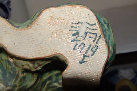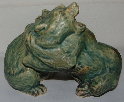 Royal Copenhagen Stoneware Bear Figurines designed by Knud Kyhn. This made in 1919. Done in a rare green glaze. Measures 17cm x 12cm og er i god stand.