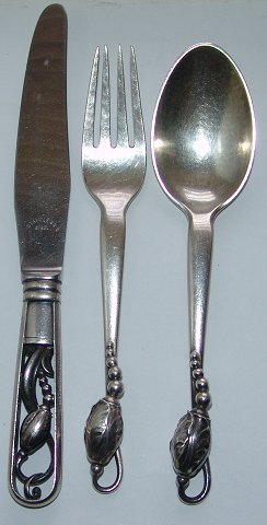 Georg Jensen Magnolia Sterling Sølv Bestik Sæt 3 dele. Kniv måler 19,8cm, gaffel 17cm og ske 17,5cm. Fremstår i god stand.