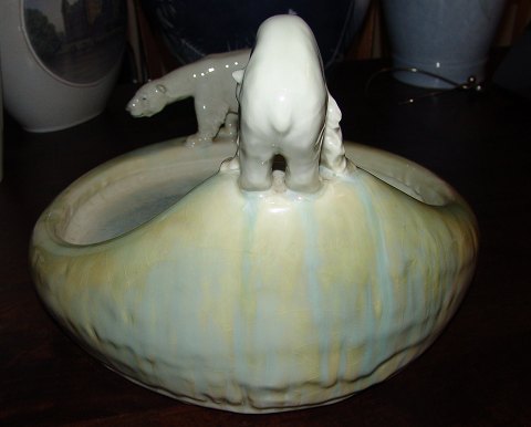 Stor Royal Copenhagen Art Nouveau Krystal Glasur Skål med Isbjørne designet af Arnold Krog og Glasur af Frederik Ludvigsen No 851. I helt og fin stand. Men har lidt fra brændningen i bunden. Hedder Nordpolen, et navn den fik fra Verdensudstillingen i 1900. Måler 40cm lang og 23,5cm høj.