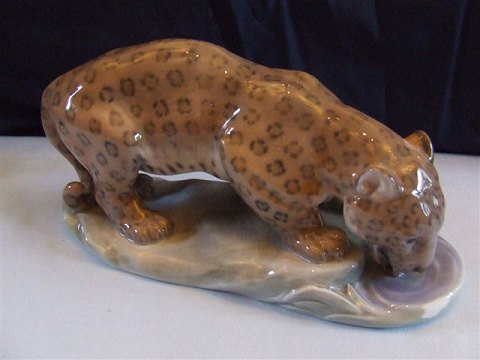 Royal Copenhagen Figur Jaguar på base der Drikker No 1469. Er i god stand, men har et glasur mærke på basen, hvilket er derfor den er mærket som anden sortering.
