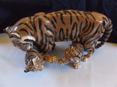 Royal Copenhagn Figur Tiger med 2 unger No 4687. Måler 28cm x 18cm og er i god stand. Designet af Jeanne Grut.