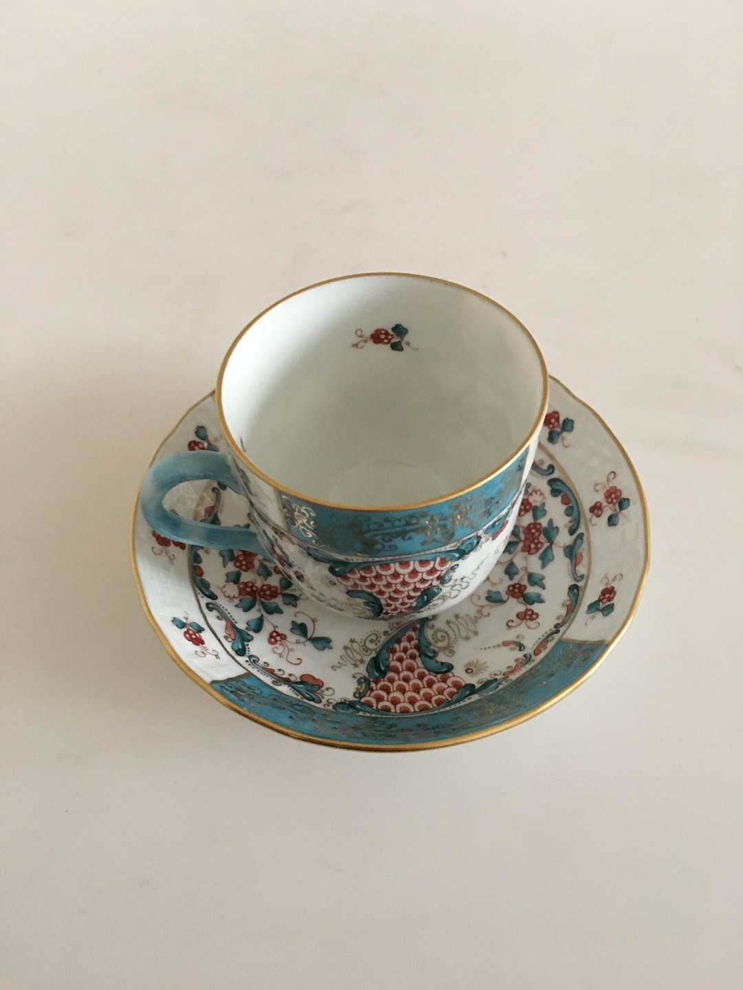 Herend Cornucopia (TCA) Coffee Cup (Mocca) and Saucer, Hungary No 1727. Cup measures 6 x 6 cm (2 23/64") Hungarian vintage Herend porcelain Coffee Cup and saucer. Hand painted with one of Herend's most magnificent pattern "Tupini, corne d'adordance" (called Cornucopia pattern in the USA) and 24K yellow gold accent. First class Herend trademark is on the bottom. Made in 1980s. Measures: cup 2 1/3" dia, saucer 5 1/8". * * * Condition: Brand New, comes from closed out store. Excellent without any damage or repair.