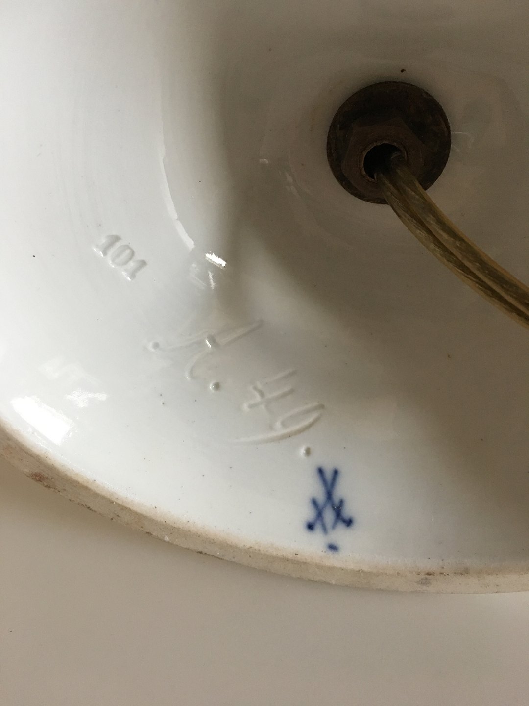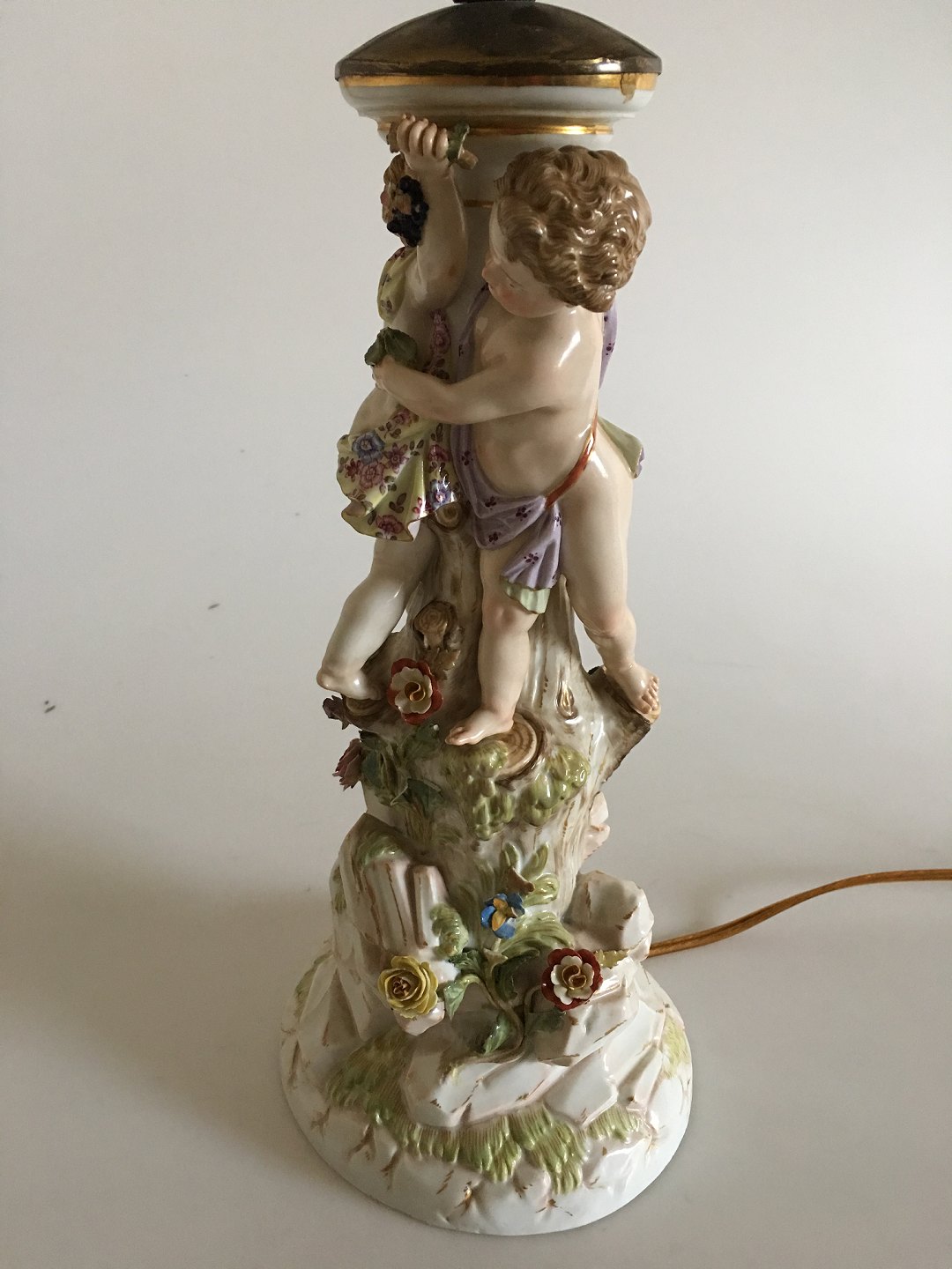 Meissen Lamp with Figurines. Measures 29cm high to the start of the mounting. Has a few chips here and there on the flowers.