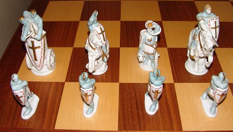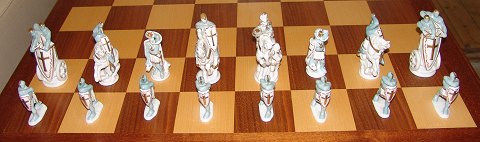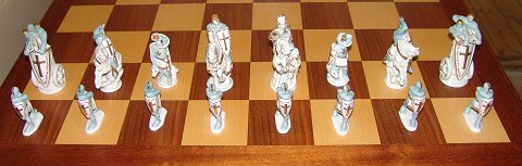 Bing & Grøndahl Skakbrikker Kai Nielsen malet af Suzette Holten Skovgaard. 16 Brikker fra det sjældende skatsæt lavet af Kai Nielsen og det her er et unika sæt malet af Suzette Holten Skovgaard. Brikker måler fra 8,7cm til 13,5cm.