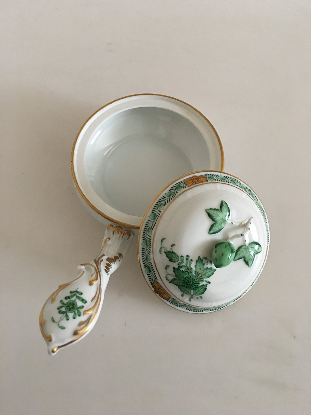Herend Ungarsk Chinese Bouquet Apponyi Grøn Kasserole Skål med låg. Måler 19,5cm og er i god stand.