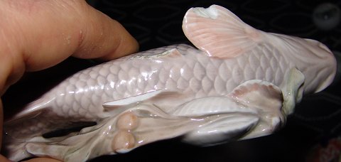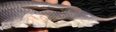Royal Copenhagen Art Nouveau Carp fish on seaweed and clams No 562. Measures 22,5cm and has damage.