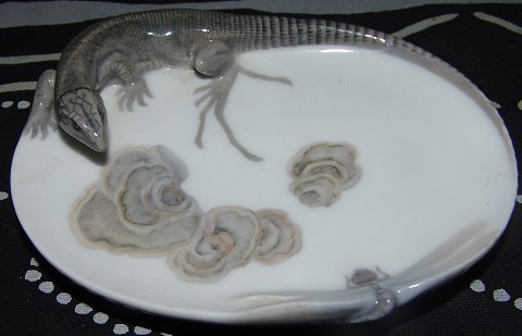 Royal Copenhagen Art Nouveau Lizzard and dragon fly dish No 552/287. Measures 13cm and is in good condition.