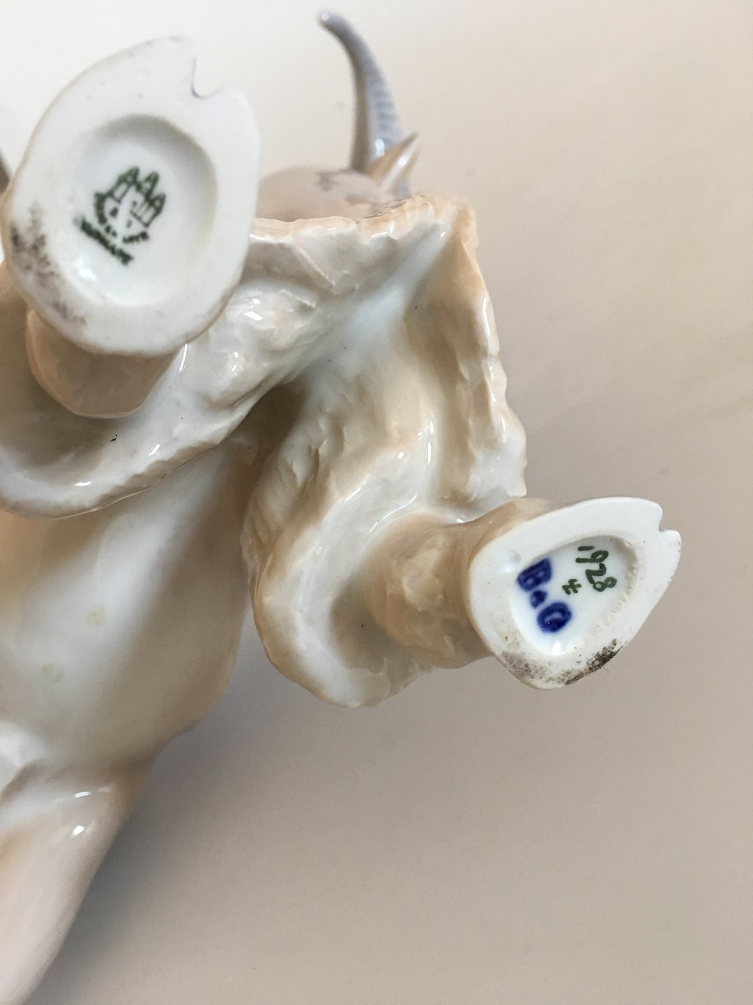 Bing & Grøndahl Art nouveau Figur af en Bjerg Ged No 1928. Måler 23cm. 2. Sortering. Har en brændingsfejl ved den ene baghove (se billede). Ellers i fin hel stand.