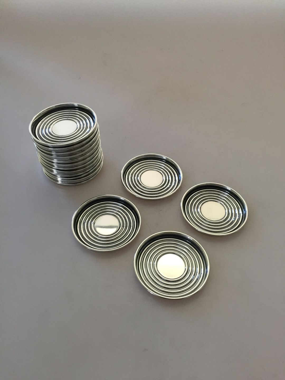 Hans Hansen Sterling Silver Karl Gustav Hansen Glas Coasters. Measures 7,3cm and is in good condition. We currently have 16 in stock.
