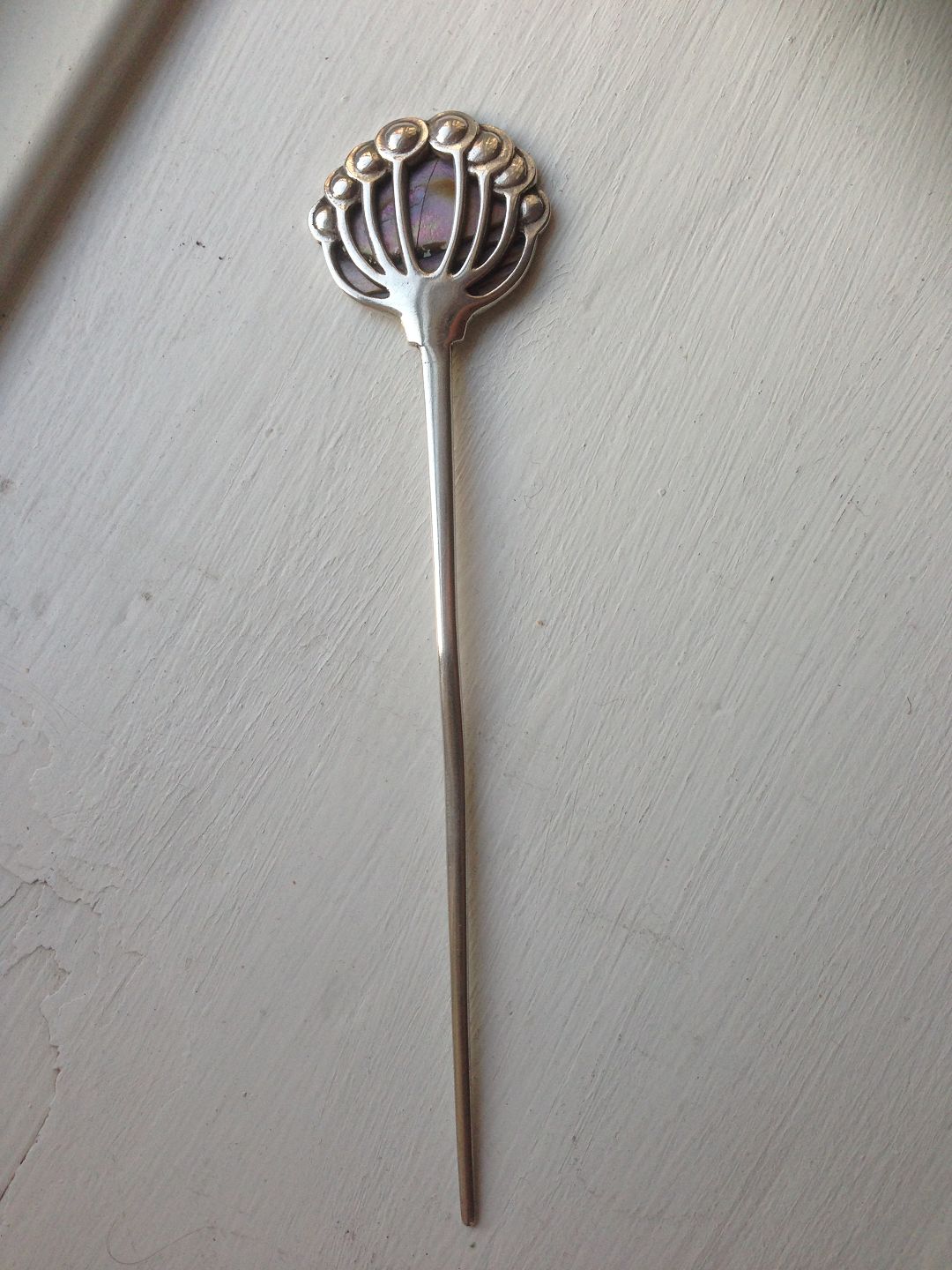 Mogens Ballin Silver Hair Pin/Needle with Mother of Pearl. Measures 17cm and is in good condition, except for a crack in the mother of pearl.