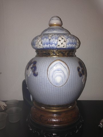 Bing & Grøndahl Art Nouveau Fanny Garde Unique Vase from 1923 in 3 parts with gold decoration by Theodor Larsen. Measures 43cm with wooden base. Her and Effie Hegermann-Lindencrone did some of the best work at the factory.