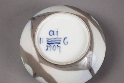 Roya Copenhagen Art nouveau Unique Vase by Anna Jørgensen from 1891 No 2907. Measures 11cm dia and 5cm high. Is in good condition, but has two firing cracks on the inside top rim.