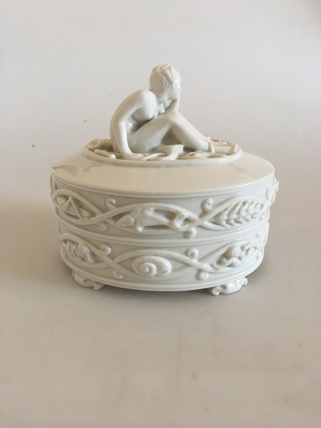 Bing & Grøndahl Art Nouveua Bonbonniere med dame, græshoppe, fisk, bille, snegl og firben Sigfried og Olga Wagner?. Måler 17cm x 16cm og er i perfekt stand.