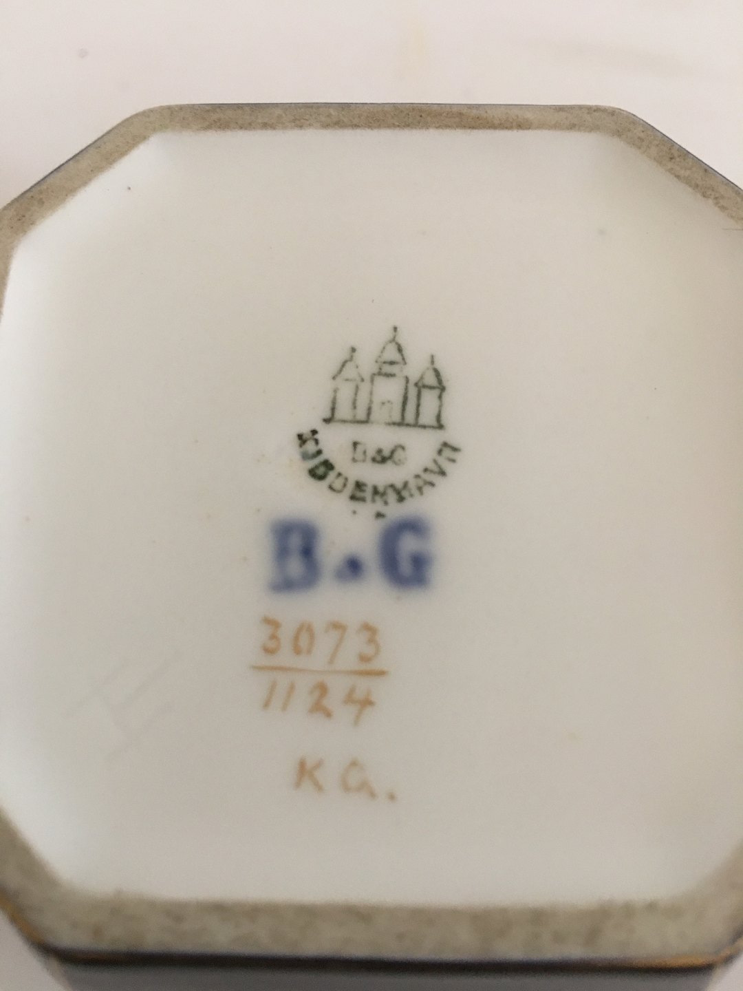 Bing & Grondahl Art Nouveau Lidded dish No 3073/1124. Measures 8,5cm x 8,5cm and is in perfect condition.