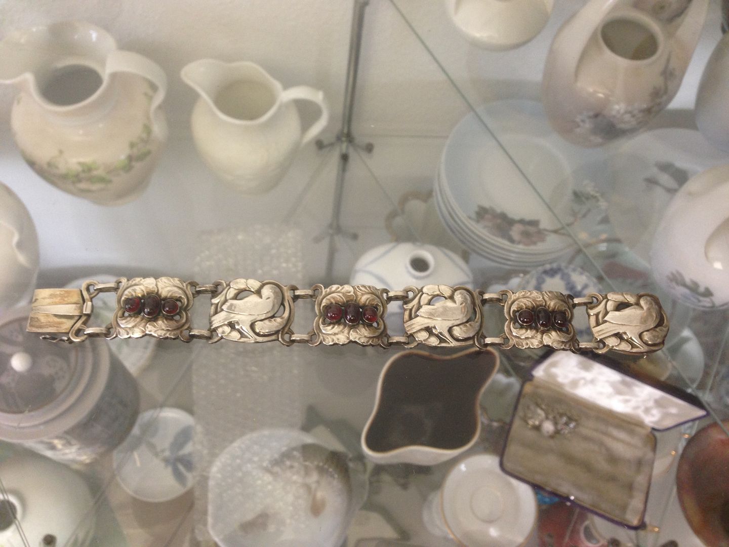 Georg Jensen Sølv Due Armbånd med granater No 14 fra 1930erne. Måler 19cm og er i perfekt stand. Vi har 2 lignende armbånd med andre sten.