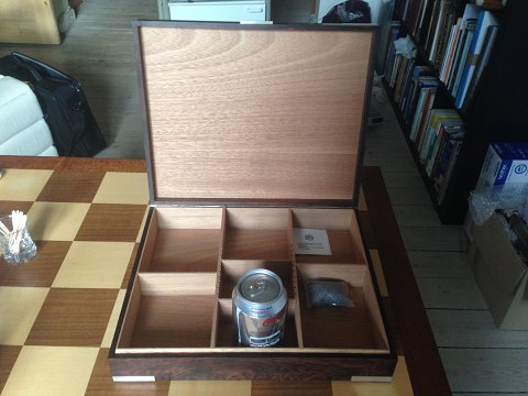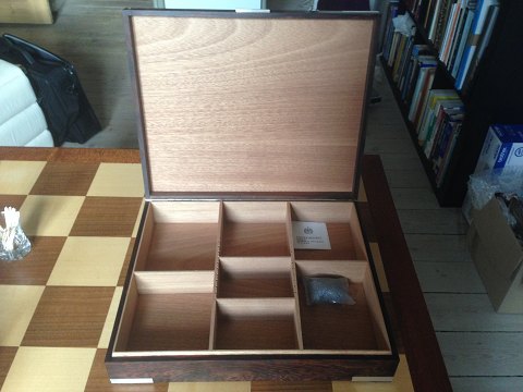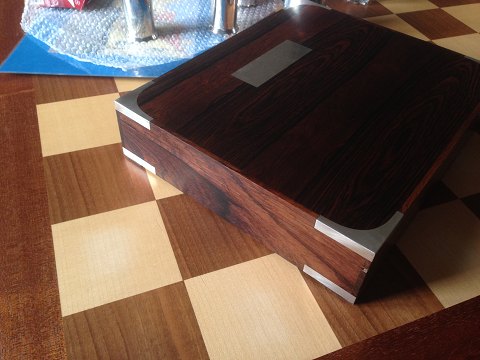 HUGE Hans Hansen Sterling Silver and Palisander/Rosewood box. Very Rare and is in perfect condition. Measures 34,5cm x 28,5cm x 7,5cm. As in new condition. Never been in use, so No smell of tobacco. I have had many dozen of Hans Hansen Silver/Rosewood boxes, but never seen this large one before