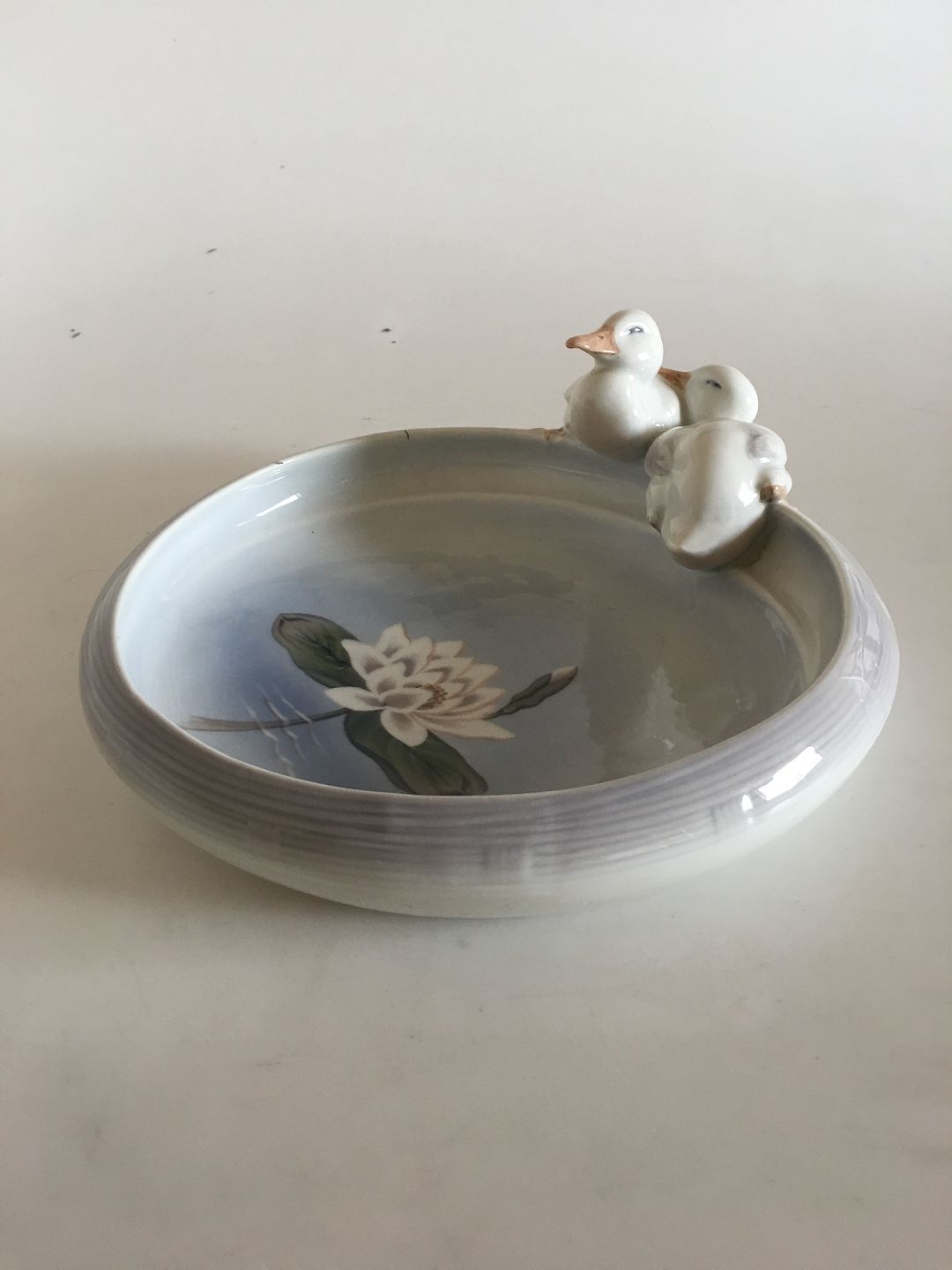 Royal Copenhagen Art Nouveau Bowl with two ducks No 358. Measures 25cm. Is not first quality as it has a factory burning mistake. Otherwise in good condition.