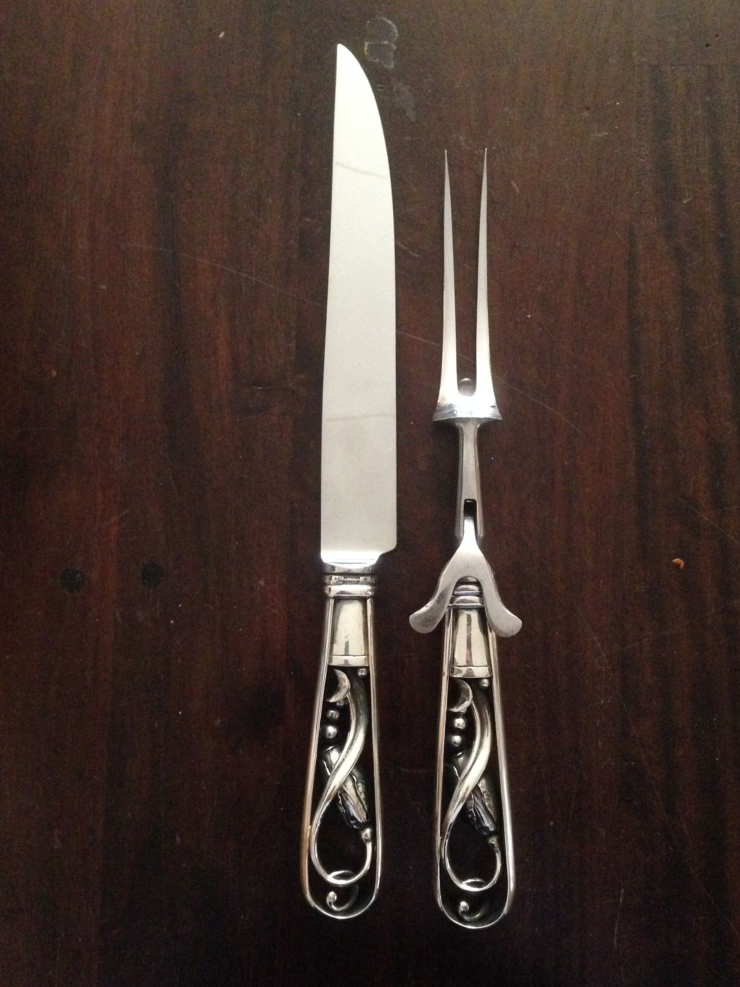 Georg Jensen Magnolia Sterling Sølv Skærforsæt Kniv og gaffel. Måler 30,8cm og 27cm. i god stand.