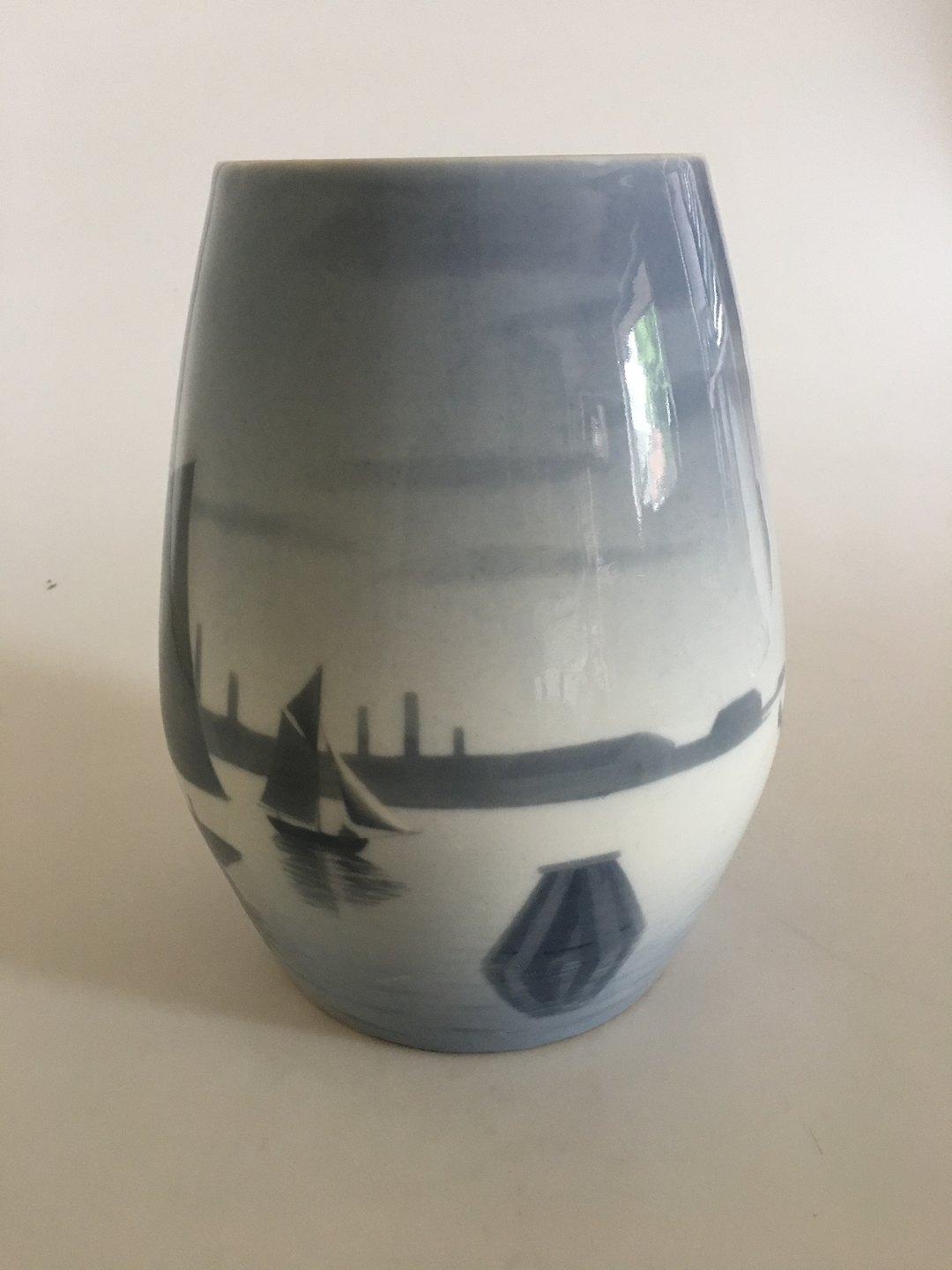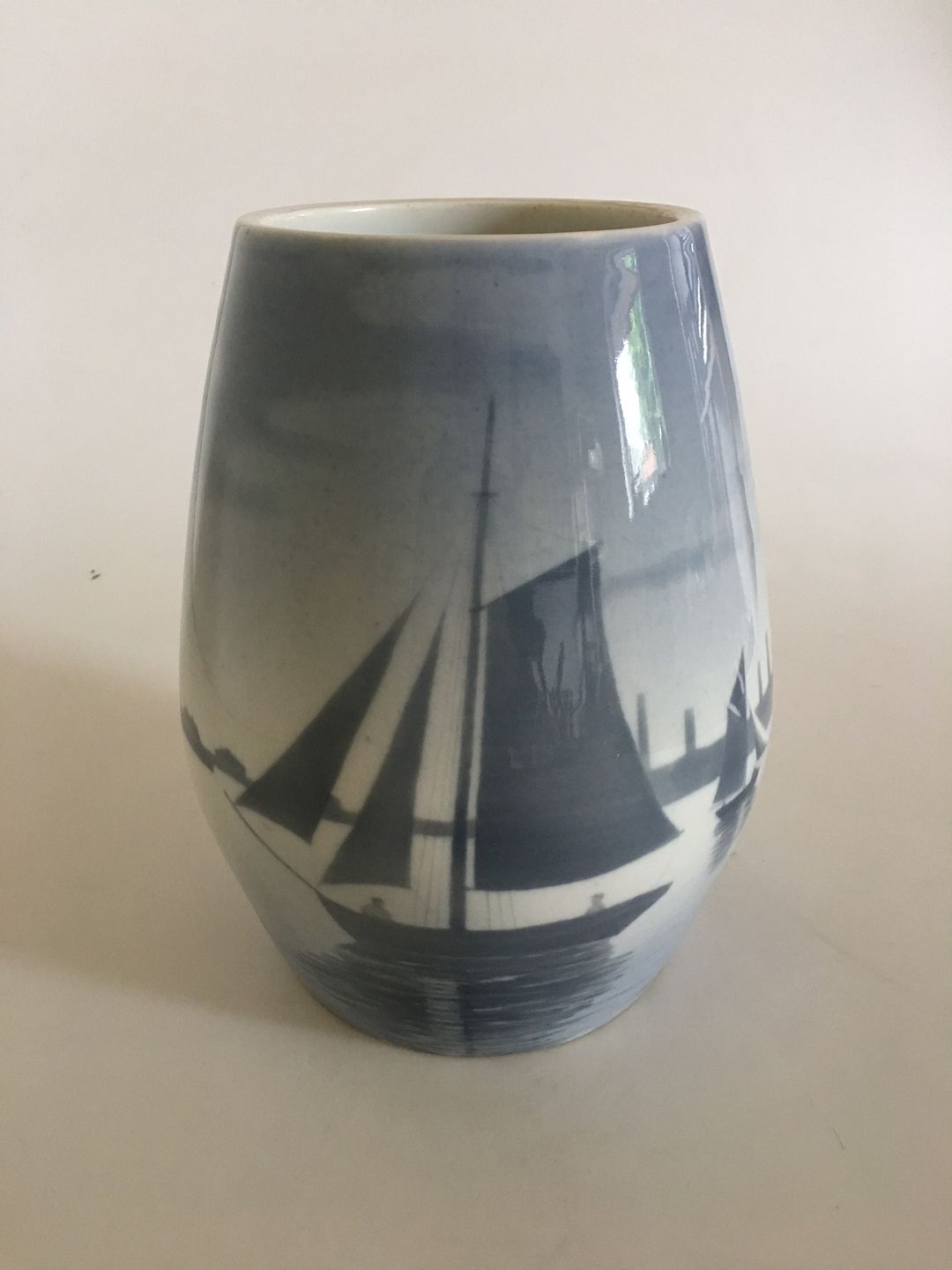 Early Bing & Grøndahl Unique vase by Fanny Garde with ships No 214. Measures 23cm and is in good condition. Very early vase by Fanny Garde and unusual motif.