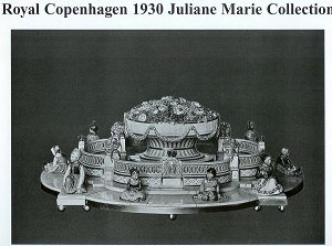 Royal Copenhagen 1930 Juliane Marie Collection (Reprotryk) For fanciers and feinsmeckere presented here the best in Danish porcelain art in a reprint of the original Royal Copenhagen catalog from 1930. The complex over the glaze art presented here in a catalog from 1930. The name Juliane Marie refers to both Royal Copenhagen's first patron Queen Juliane Marie and the hand-painted crown in the 20th century marked that a piece of porcelain was decorated with the difficult overglaze technique. The book is in hardcover and measures 24.5 x 30 cm. Hardcover with a single black-and-white dust jacket. Published by DPI in the US with the permission of Royal Copenhagen. Printed in China 2005. The preface is in English, but otherwise it's the pictures that speak. 2 color plates and 78 black and white plates include reproductions of 1800-century pieces and figures of Carl Martin-Hansen, Gerhard Henning, Arno Malinowski, Christian Thomsen, Axel Locher, Michael Pedersen, Hans Hansen and Georg Thylstrup