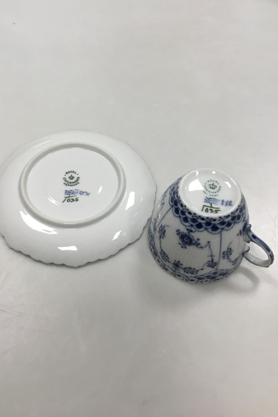 Royal Copenhagen Blue Fluted Full Lace Coffee Cup and Saucer No. 1035. Cup measures 6.5 cm (2 9/16") and saucer 13.7 cm (5 25/64").